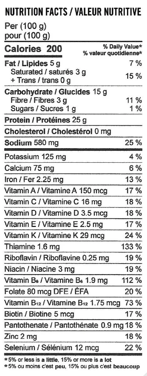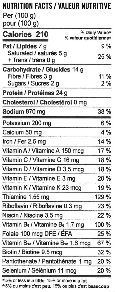 Chickpeas (water, salt), Water, Non-GMO Wheat Gluten, Refined Coconut Oil, Non-GMO Soy Sauce (water, wheat, soybeans, salt), Nutritional Yeast, Non-GMO Miso (water, rice, soybeans, salt), Apple Cider Vinegar, Sea Salt, Shiitake Mushroom Powder, Organic Superfood blend (dehydrated fruit & vegetable blend; dehydrated whole spinach, broccoli, carrots, sweet potato, orange, sunflower seeds, apple, strawberry, Shiitake mushrooms and Maitake mushrooms], organic sprouted buckwheat, organic sprouted millet, organic flax, organic Salba® chia, organic quinoa), Spices CONTAINS: GLUTEN AND SOY